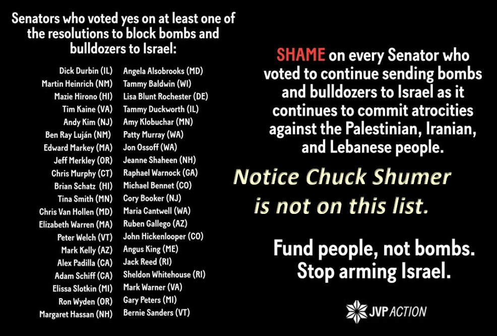 Significantly, Joint Resolutions of Disapproval (JRDs) are being tried to block Israeli war handouts. So far, Schumer has snuffed it, to keep the blood money flowing.